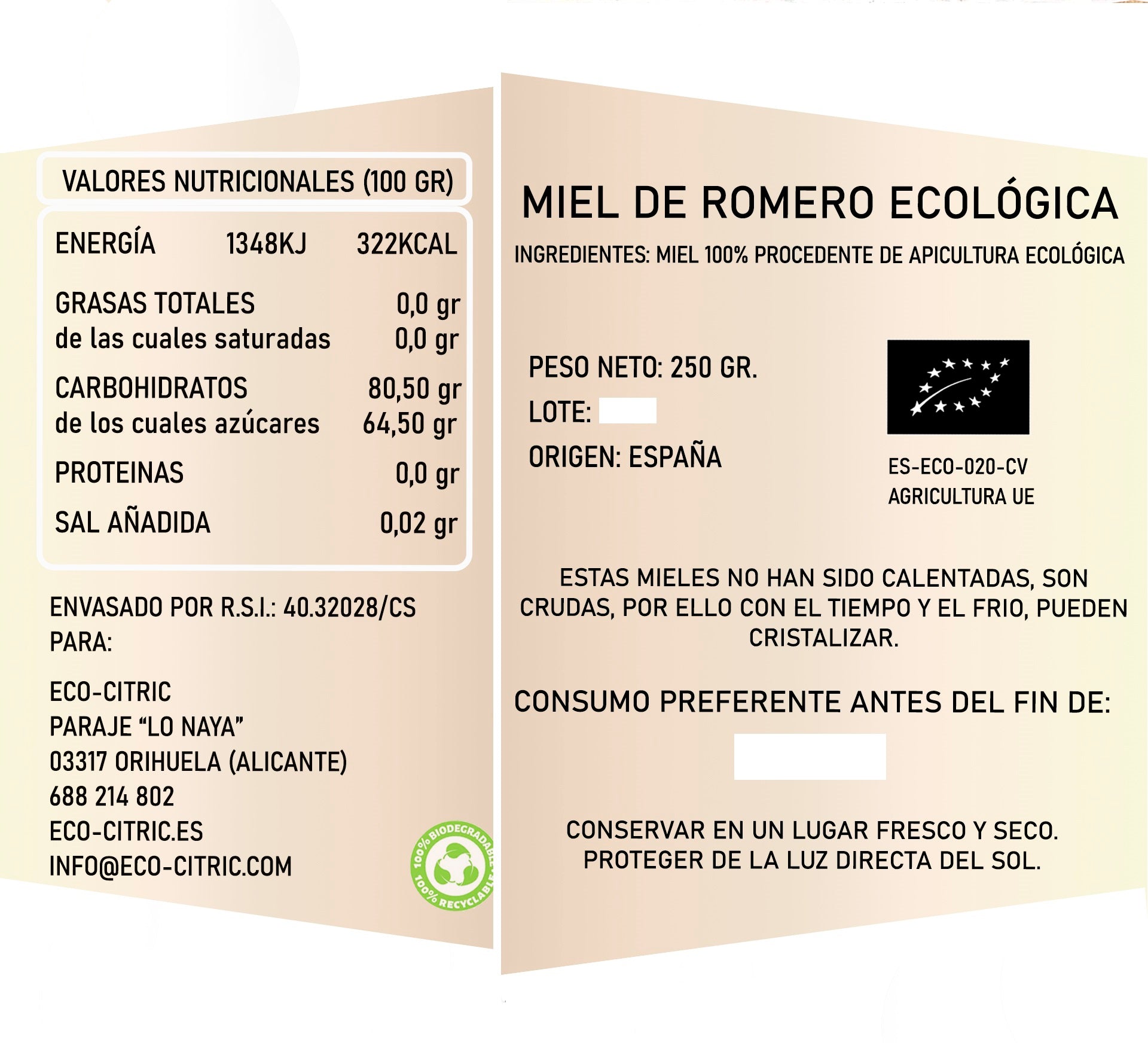 Esta miel no es industrial, ni procesada, ni tiene mezclas raras. Es miel ecológica, hecha como las de toda la vida, gracias al trabajo incansable de nuestras abejas, que liban las flores de azahar de los naranjos en primavera. De ahí ese aroma tan delicado y ese sabor suave, con toques florales que no empalagan.